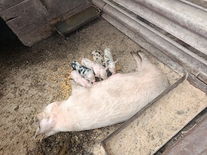 Scroafa landrace montată cu porc din rasa duroc, 5 purcei de 3 săptămâni.