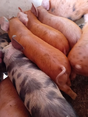 Scroafa landrace montată cu porc din rasa duroc, 5 purcei de 3 săptămâni.