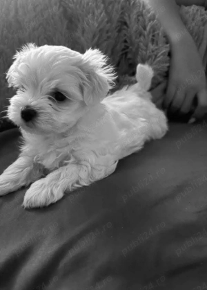 Pui bichon maltez rasă pură cu vârsta de 8 săptămâni, cu 3 deparazitări și două vaccinuri. Puii sunt crescuți cu hrană premium royal canin mini starter și învățați să-și facă nevoile la pled.