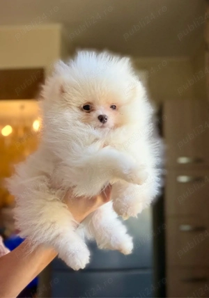 pomeranian alb, de3luni , absolut superb! Este un băiețel jucăuș, plin de energie și foarte afectuos. Dețin ambii părinți, care au pedigree, și are carnet de sănătate la zi. Este un cățel deosebit, gata să aducă multă bucurie într-o nouă familie!