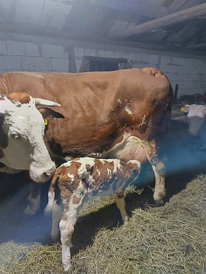 Vând vacă din rasa Bălțată Românească, în vârstă de 7 ani, proaspăt fătată (de 4 zile). Greutate aproximativă: 800 kg Foarte blândă și ușor de muls, atât la mulgătoare cât și manual Producție garantată: 25 litri lapte zi (se oferă probă de muls la fața locului) Însoțită de tăuraș în vârstă de 4 zile Animal ...