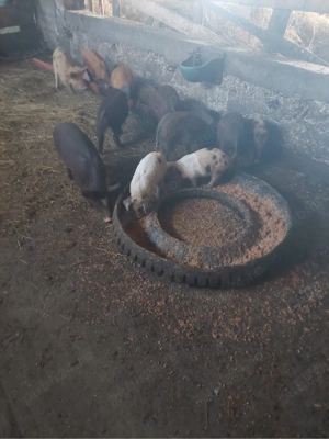 vând 3 purcei și 10 soldani , 900 lei toți purceii și soldani intre 400 si 500 bucata 30 -35 kg , rasa este Duroc cu Pietran și toți masculi sunt castrați