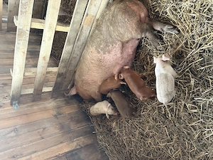 Scroafa landrace montată cu porc din rasa duroc, 5 purcei de 3 săptămâni.