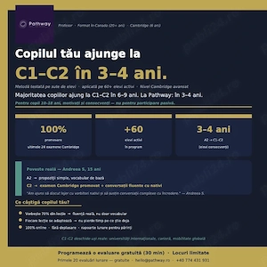 Cursuri de Engleză Online pentru Copii (10 18 ani) | Progres Accelerat Cambridge A2 C1 Vrei ca copilul tău să vorbească engleza fluent, nu doar să o învețe din manuale? La Pathway English School, elevii noștri avansează un nivel Cambridge la fiecare 12 15 luni, complet online. Ce oferim: Cursuri interactive, ...