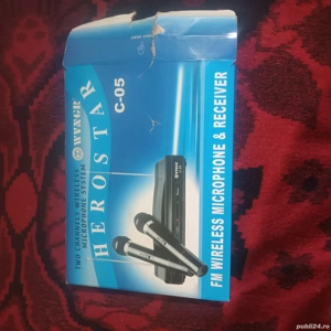 Vând set microfoane wireless WYNGIR Herostar C-05, cu 2 canale, în stare foarte bună, folosit o singură dată. Pachet complet: 2 microfoane wireless Receiver cu 2 antene Cablu audio Cutie originală Ideal pentru: Karaoke Evenimente mici Biserică, școală Prezentări, petreceri Funcționează perfect ...