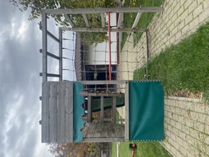 Vând loc de joacă cu topogan perete și plasă de cățărat din lemn impregnat stare foarte buna