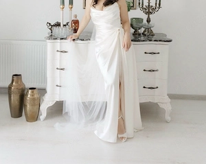 Rochie de mireasă Divine Atelier model Danielle + voal cadou (colecția 2025) Vând rochie de mireasă Divine Atelier, model Danielle, realizată din mătase naturală, culoare ivory, cu o croială elegantă și rafinată. Purtată o singură dată, rochia este în stare impecabilă, curățată profesional. Mătase ...