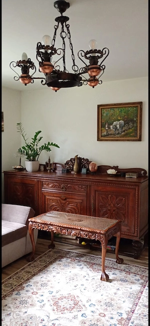 Vindem credent din lemn masiv sculptat, măsuță din lemn masiv sculptat, lustra vintage. Se pot vine individual sau la pachet.