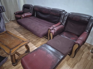 Atat canapeaua cat si fotoliile sunt extensibile. Pielea este decolorata in zonele de uzura, partea textila foarte putin uzata. Nu are defecte majore si totul este functional. Nu asigur transport sau manipulare. Se poate ridica din Bucuresti, Stirbei Voda zona Ateneu.