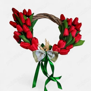 Coronita decorativa din lalele roși,creatie unica ce decorează ușa în întâmpinarea primăverii,făcută sa aducă un moment de bucurie și prospețime,si o nota de culoare. Înălțime cca 40 cm lățime cca 55 cm. Produse noi, hand made, made în România. Comanda și informații telefon sau whats app sau mesaj.