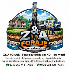 Z&A Foraje execută foraje puțuri de apă între 40 și 150 metri, pentru gospodării, ferme și aplicații industriale. Execuție rapidă Echipamente moderne Lucrări durabile și profesionale Soluții complete: foraj, tubare, echipare Lucrăm în toată zona și ne deplasăm la locația clientului. ...