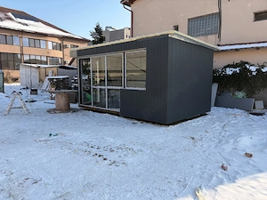 Dimensiuni 5m pe 3m inaltime 2.5m. Structura metalica Panou sandwich de 20 cm Tamplarie aluminiu Geam securizat de 8mm Pardoseala interioara placa tego de 18mm
