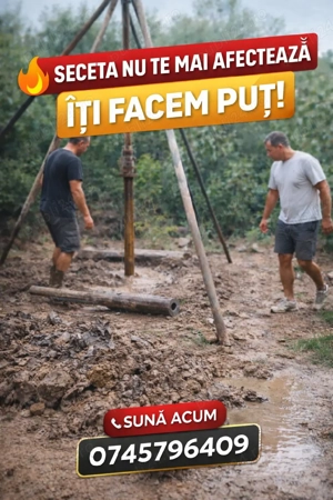 S-A SCUMPIT APA? SECETA ȚI-A DISTRUS GRĂDINA? Nu mai sta la mila ploii sau a facturilor! Îți facem PUȚ PROPRIU apă NON-STOP, direct la tine în curte! Forăm rapid și eficient Denisipăm și curățăm puțuri vechi Scapi de facturi mari la apă Uzi grădina fără stres, oricând vrei NU MAI ...