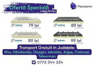 Oferta Specială Depozit Panoterm: Vindem din stoc panouri sandwich economice, marca Isopan, pentru hale, garaje, containere sau compartimentări, în cea mai căutată culoare a momentului: Gri Antracit (RAL 7016). Panou Perete (30mm) RAL 9002 (Alb-Gri): 79 Lei mp (TVA inclus) Panou Perete (40mm) RAL 7016 ...