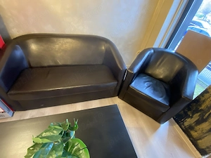 Canapea mică și fotoliu din piele neagră, plus o masă de cafea. Mobilierul este folosit, dar încă în stare bună de utilizare. Poate fi o achiziție interesantă pentru amenajarea unui spațiu de relaxare.
