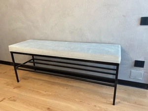 Bancă cu șezut tapițat și raft pentru pantofi foarte solida, facuta la comanda, perfectă pentru hol, dormitor sau zona de intrare. - Structură solidă din metal negru durabilă și stabilă - Șezut confortabil, tapițat cu material textil de calitate - Raft inferior din bare metalice ideal pentru depozitarea ...