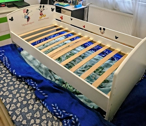 Pat copii cu personaje 164 cm lungime cu 86 cm lățime ,saltea 6 cm grosime inclusa, stare foarte buna.Predare personală sector 4 București.