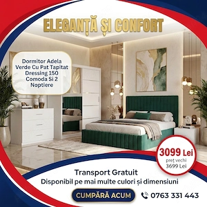 Dormitor Adela Verde Cu Pat Tapitat Dressing 150 Comoda Si 2 Noptiere Model popular Mobilă dormitor