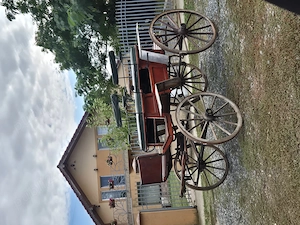 Vând caruta ornamentala ptr curți sau grădină, L 2.10, l 1, H 75. Lungimea căruței cu căluț este de 3.20 m. Inf telefon.