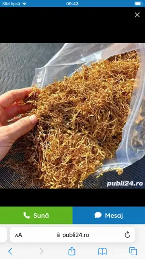 Vând tutun natural, curat, proaspăt și de calitate superioară. Tutun 100% natural, fără aditivi, praf sau mirosuri artificiale, ideal pentru țigări rulate sau injectate. Detalii produs: Diferite mărci disponibile, de la tutun firicel fin până la tăieturi clasice Textură curată, tocat uniform, fără resturi ...