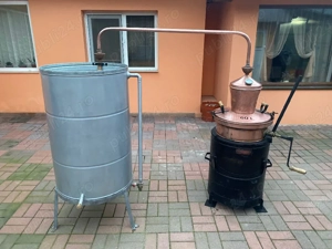 Cazan din cupru de 60 litri cu amestecător mecanic integrat și termometru de precizie pentru controlul temperaturii în timpul distilării. Răcitor de 320 litri, fabricat din tablă de oțel galvanizat, echipat cu serpentină din cupru pentru eficiență termică ridicată. Focar pentru lemne, confecționat ...