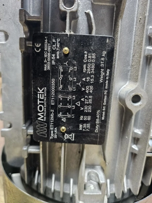 Motor trifazic MOTEK Italy, 7,35 Kw, 2850 rpm, produsul este nou și are deja montata pe el fulie cu 5 rapoarte pentru curea poly-V. Greutatea motorului fără fulie este de 31,6 kg la care se adaugă și fulia de aproximativ 5 kg.