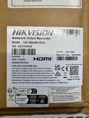 NVR Hikvision 64 canale DS-9664NI-M16; pana la 2-ch@32 MP 2-ch@24 MP 4- ch@12 MP 8-ch@8 MP 16-ch@4 MP 32-ch@1080p decoding capacity, H.265 + H.265 H.264+ H.264, iesiri: 2x HDMI, 2x VGA, 1x CVBS BNC (1.0 Vp-p, 75 ), 16x SATA max 16TB pe HDD, alimentare: 100 to 240 VAC, 50 to 60 Hz, dimensiuni: 445 ...