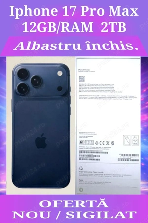 Apple iPhone 17 Pro Max Capacitate de stocare: 2 TB RAM: 12 GB Culoare: Albastru închis Nou, ambalajul original este încă sigilat Produs original --> Produs german fără restricții! (Factură + Garanție) Include: iPhone 17 Pro Max, cablu USB-C la USB-C, manual de instrucțiuni, ambalaj original. P.S. ...