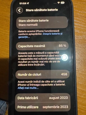 Se vinde iPhone 15 128 GB, stare foarte bună. Telefon personal, folosit normal, fără intervenții în service și fără piese schimbate.Funcționează impecabil Face ID, camere, difuzoare, senzori, totul perfect. Baterie: 85%Liber de iCloud (se resetează la predare)True Tone prezent fără mesaje de eroare ...