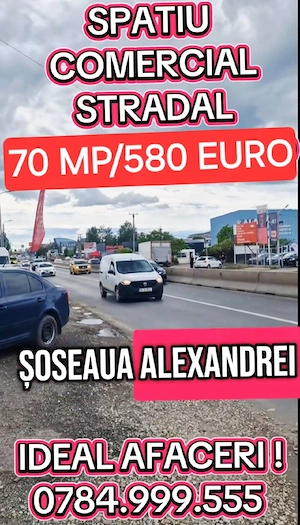 OCAZIE! LA NUMAI 2.900LEI (580E) SPATIU STRADAL ,AMENAJAT LA CHEIE -70MP PE ȘOSEAUA ALEXANDRIEI DISPUNE DE FRONT STRADAL VIZIBIL,VITRINA MARE,I,GRUP SANITAR PROPRIU, AER CONDITIONAT ,DEPOZIT CU TOT CE TREBUIE UNEI AFACERI LA CHEIE SUPER VAD-SUPER POZITIE-ZONA MIXTA CU BLOCURI SI CASE SPATIUL ESTE ...