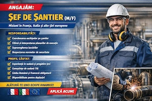 Angajăm: Șef de Șantier (M F) În contextul dezvoltării rapide a companiei noastre, căutăm viitorul nostru Șef de Șantier pentru a susține dezvoltarea activităților noastre în domeniul instalațiilor de țevi piping pentru sectorul terțiar și industrial. Responsabilități: Coordonează și gestionează ...