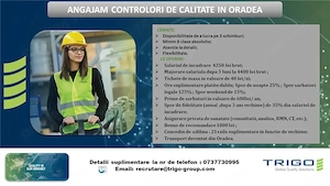 TRIGO, lider mondial in oferirea de servicii de calitate in domeniul AUTOMOTIVE angajeaza in Oradea pentru postul de CONTROLOR CALITATE. CATE SCHIMBURI? 3 schimburi CE OFERIM? Salariul de incadrare : 4250 ron brut. Majorare salariala la 4400 ron brut dupa 3 luni. Tichete de masa in valoare de ...