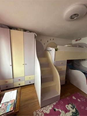 Mobila copii care este compusa din dulap , scar , pat etajat cu 5 sertare si 4 polite Paturile au dimensioned de 2x90 m Dulapul120x50 m ,cu ânaltimea de 220 m cu tot cu picioare . Paturile vin cu saltele care sunt ântro stare foarte bun . Mobila este ântro stare foarte bun , numai 2 butoane de la sertare ...