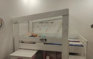 Patut foarte practic si placut pentru cei mici, birou rabatabil, rafturi pentru jucarii sau carti si "locul de joaca secret" sub pat. Dimensiunile patului sunt de 90 200 cm. Trebuie demontat si transportat de catre cumparator Patul se vinde cu saltea inclusa in prret.