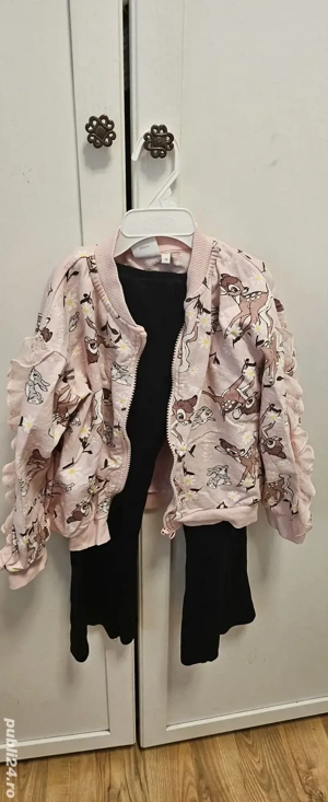 Hanoracul cu Bambi are volănașe pe mânecilor pantalonii sunt evazați. ținută este pentru fete 4-5 anișori. Ofer si un tricou cadou