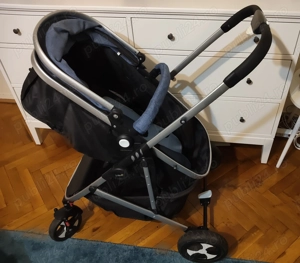 conține landou,scoică auto și parte sport + accesorii( mănuși mâner,sac pt sezonul rece , pelerină ploaie,geantă de scutece și geantă de depozitare. are niște zgârieturi pe cadru de la cum a fost pus în portbagaj și avion însă se poate vopsi dacă e necesar iar o clapeta de la roată este îndoită însă ...