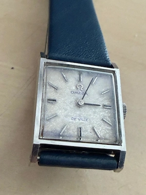 Ceas Omega DeVille mecanic pentru dama, calibrul 620, dimensiuni 20x20x8 mm, model 1975, cadran gri cu reflexe albastrii, indicatori negri, servisat in martie 2026, curea de piele noua, albastra, fara schimburi.