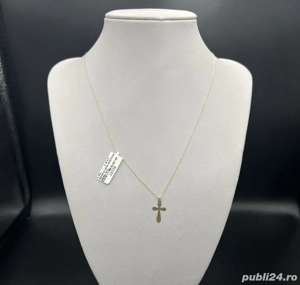 Lant elegant din aur 14k cu o cruciuliță nou. Gramaj 0.88gr si 48cm maxim cu Prelungire. O bijuterie clasică și rafinată, potrivită pentru orice ocazie. Se poate verificat la bijuterie sau amanet. Predare personală în Pitesti. Nu trimit. Pret 400lei pret fix.
