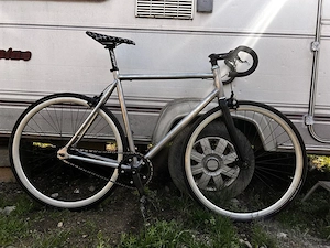 Material cadru aluminiu Culoare gri Mărimea 57,5 Roți Gipiemme Pista Fixed Șa Cinelli Smiley Tija șa Zipp Manete frâna Tektro Clești frâna Shimano 105 Angrenaj Rpm (FSA) 48 T Pinion Blb London 17 T Lanț Izumi Japan Furca Drag pista