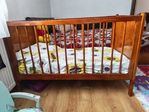 Gratis, pătuț pentru copil până la 3 ani din lemn, cu saltea și așternuturi. Donăm și hăinuțe de copil de la 0 la 3 ani.