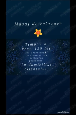 MASAJ DE RELAXARE LA DOMICILIU. Preț: 120 lei Timp: o ora Pret: 160 lei Timp: o ora și 30 minute Masajul se face cu dumneavoastră fiind nud, acoperit cu un prosop pe fese, se folosește crema, masajul se face pe tot corpul, este exclusa partea intima; este masaj de relaxare și masaj pentru musculatura. Programul ...