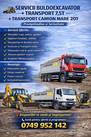 Servicii Buldoexcavator + Transport 7,5T Promptitudine și Seriozitate Dispun de buldoexcavator și camionetă 7,5 tone și execut lucrări în construcții pentru persoane fizice și firme. Servicii oferite: Demolări case, anexe, garduri Săpături fundații case, garduri, terase Săpături pentru ...