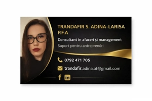 Ofer servicii de consultanță în afaceri și management. Dacă vrei să-ți deschizi un PFA sau un SRL, dar nu știi de unde să începi sau ce ți se potrivește, ori pur și simplu nu vrei să-ți bați capul cu birocrația, te aștept să-mi scrii.