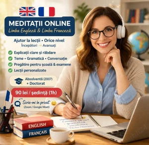Meditații ONLINE Limba Engleză & Limba Franceză Ofer ajutor la lecții și meditații la limba engleză și limba franceză pentru orice nivel de la începători până la avansați Ajutor la teme și lecții Explicații clare, pe înțelesul fiecăruia Pregătire pentru școală, examene sau conversație ...