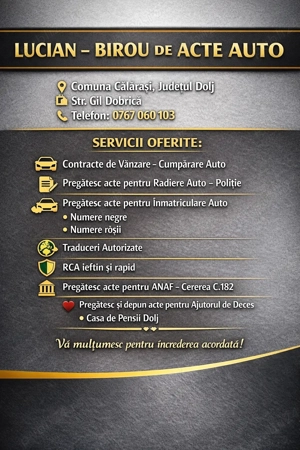 Contract de vânzare Cumpărare Auto . Pregătim Dosare Pentru Înmatriculări Poliției numere Negre și Numere Roșii. Pregătim Dosare pentru Radiere Poliție. Traduceri Autorizate Pregătesc Acte Pentru Ajutorul de Deces Casa de Pensii Dolj. Le și Depun la Casa de Pensii Dolj.vă aștept în comuna Călărași ...