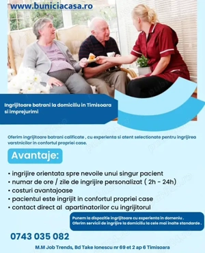 Oferim ingrijitoare batrani la domiciliu calificate , cu experienta si atent selectionate pentru ingrijitoare varstnicilor la domiciliu in Timisoara si localitatile limitrofe. Servicii : - servicii de ingrijire de la 2- 24h. - supraveghere si companie ( ziua noaptea) - asistenta cu igiena personala - ...