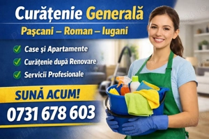 Ofer servicii profesionale de curățenie pentru case, apartamente și scări de bloc. Curățenie generală, după renovare sau de întreținere. Lucrez rapid, cu atenție la detalii și produse profesionale. Prețuri corecte și seriozitate. Pentru programări sunați la .