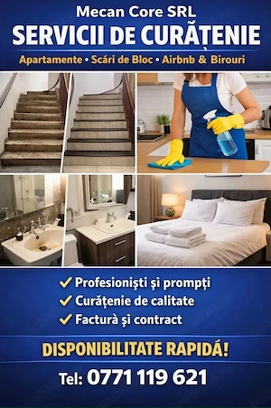 Oferim servicii complete de curățenie pentru persoane fizice și juridice în Brașov și împrejurimi. Lucrăm organizat, punctual și cu atenție la detalii, astfel încât spațiul tău să fie mereu curat și îngrijit. Ce servicii oferim: Curățenie apartamente case Curățenie după constructor ...