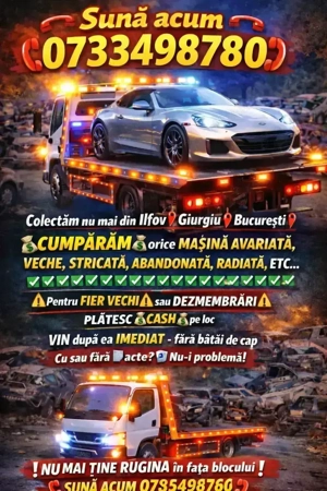 Colectăm nu mai din Ilfov Giurgiu București CUMPĂRĂM orice MAȘINĂ AVARIATĂ, VECHE, STRICATĂ, ABANDONATĂ, RADIATĂ, ETC.. Pentru FIER VECHI sau DEZMEMBRĂRI PLĂTESC CASH pe loc VIN după ea IMEDIAT fără bătăi de cap Cu sau fără acte? Nu-i problemă! NU MAI ȚINE RUGINA în fața blocului ...
