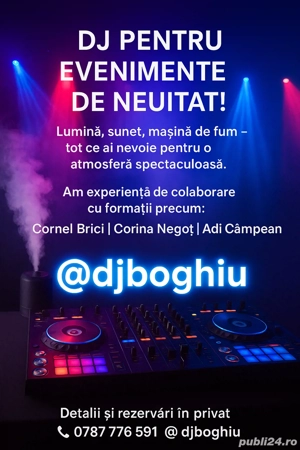 Dj evenimente! Mașina de fum, lumini tot ce trebuie pentru un eveniment de neuitat! Mă pot corela și cu formați, am experiență cu formațiile: Cornel Brici, Corina Negoț și Adi Campean Pentru mai multe informații în privat sau la Nr: